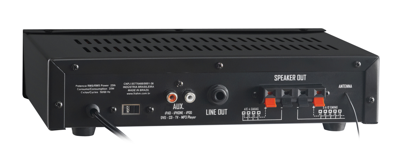 Entrada USB, SD CARD e receptor FM com controle remoto, Auxiliar - iPHONE/iPOD/CD/DV/TV/microcomputador |