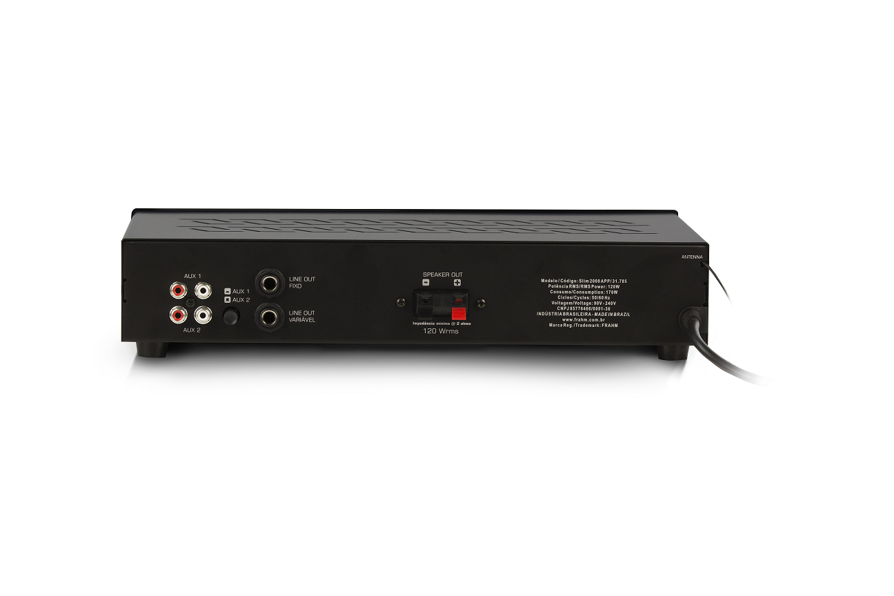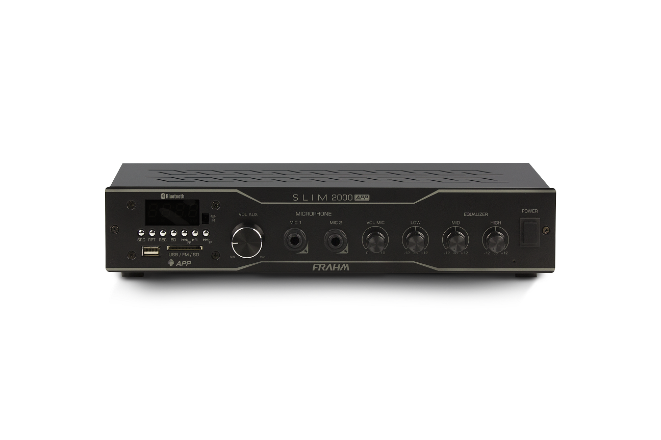 O amplificador Slim 2000 APP da Frahm possui 120 Watts RMS de potência e é ideal para pequenos/médios ambientes. Possibilita comando de funções via aplicativo Frahm, além de conexão USB, SD Card, auxiliar (RCA), entradas p/ 2 Microfones com função “Volume Inteligente” (Baixa a trilha sonora automaticamente quando usado), Rádio FM e Bluetooth.