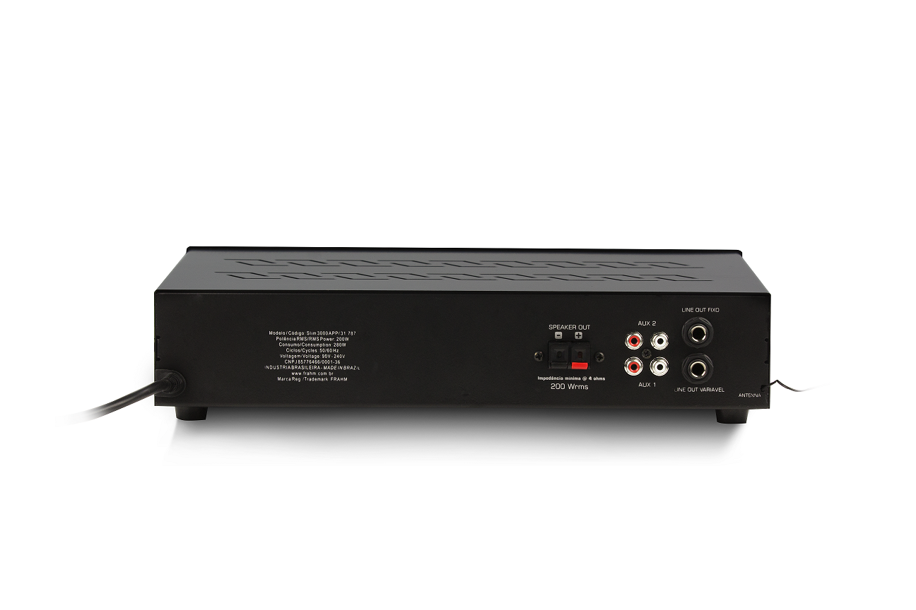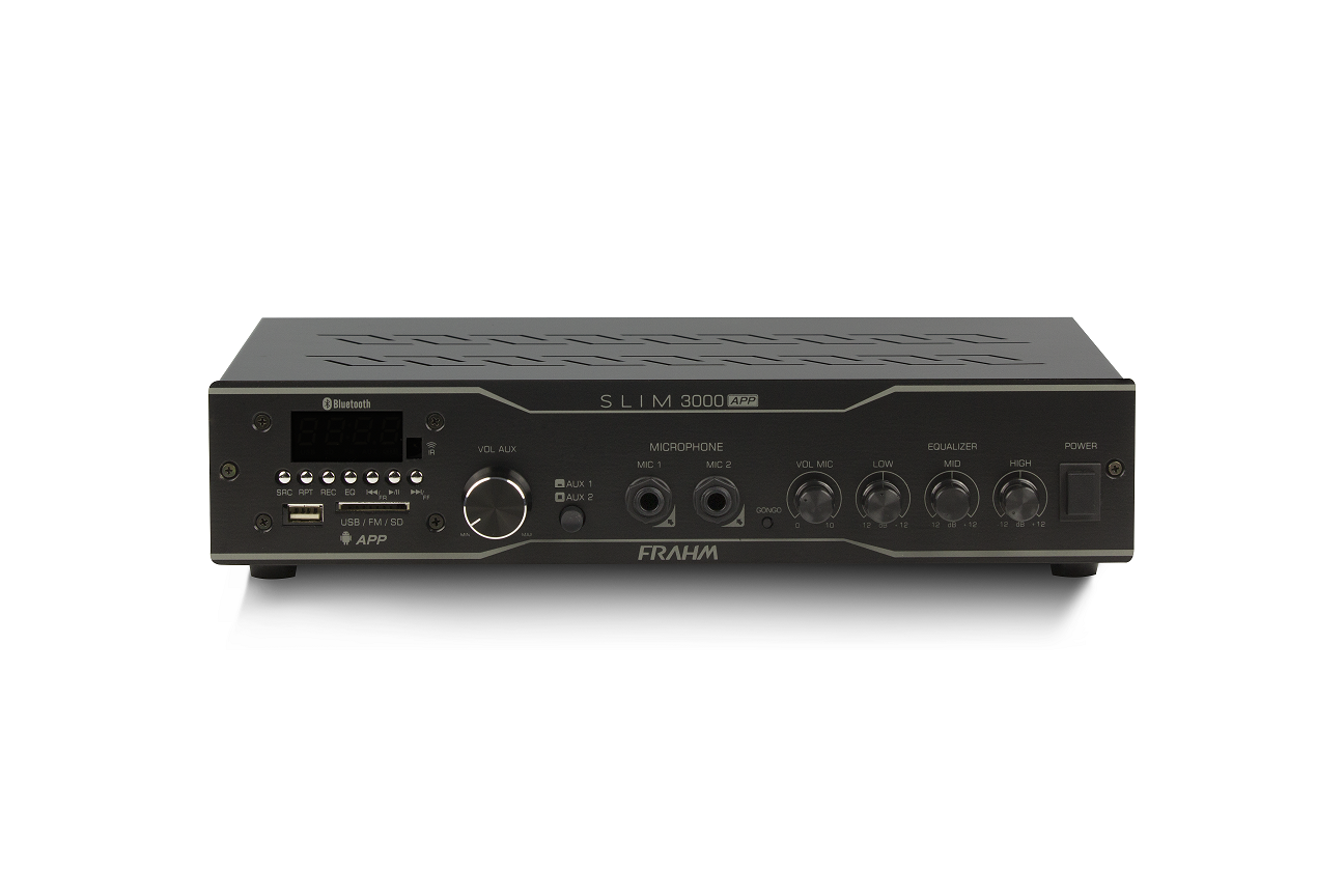 O amplificador Slim 3000 APP possui 200 Watts RMS de potência e é ideal para médios ambientes. Possibilita comando de funções via aplicativo Frahm. Possui conexão USB, SD Card, auxiliar (RCA), entradas p/ 2 Microfones com função “Volume Inteligente” (Baixa a trilha sonora automaticamente quando usado), função gongo (emite sinal sonoro para chamar atenção para uma comunicação), Rádio FM e Bluetooth.