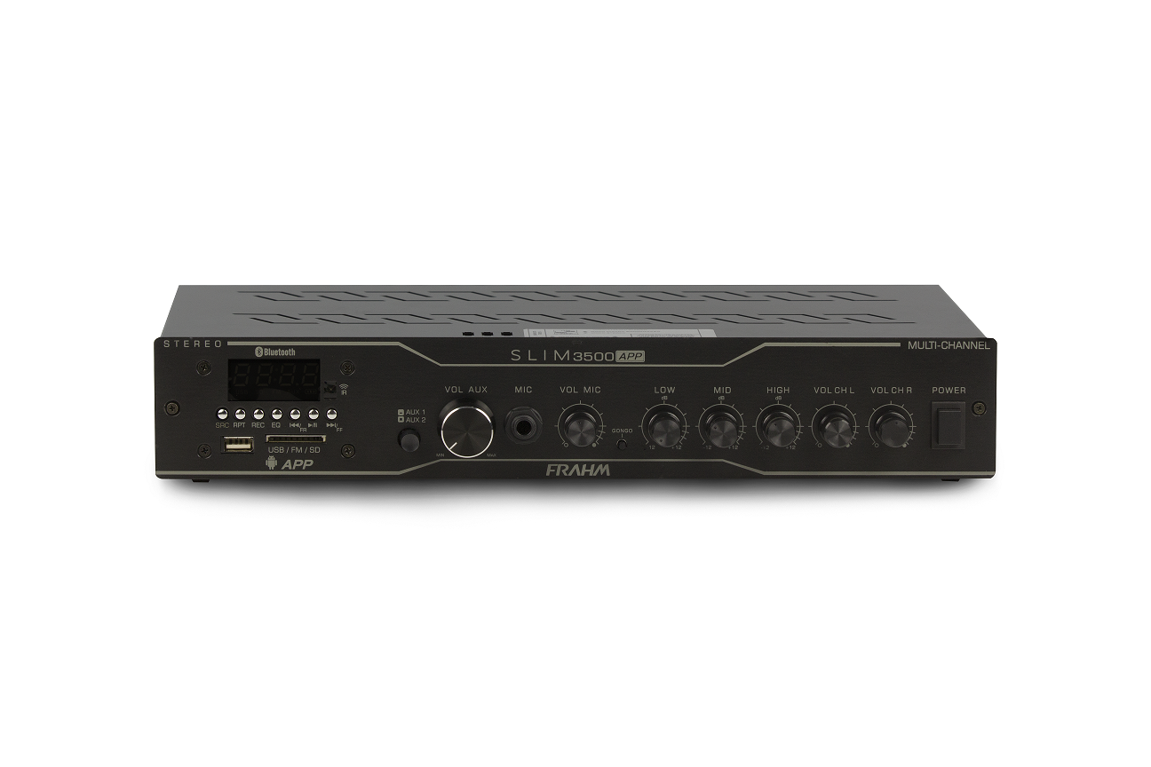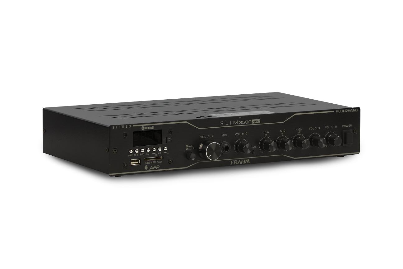 O amplificador Slim 3500 APP Multi-channel possui 240 Watts RMS de potência (2 canais de 120 W RMS) e é ideal para grandes ambientes. Possibilita comando de funções via aplicativo Frahm. Possui conexão USB, Micro SD Card, auxiliar (RCA e P2), Microfone com função “Volume Inteligente” (Baixa a trilha sonora automaticamente quando usado), função gongo (emite sinal sonoro para chamar atenção para uma comunicação), Rádio FM e Bluetooth.