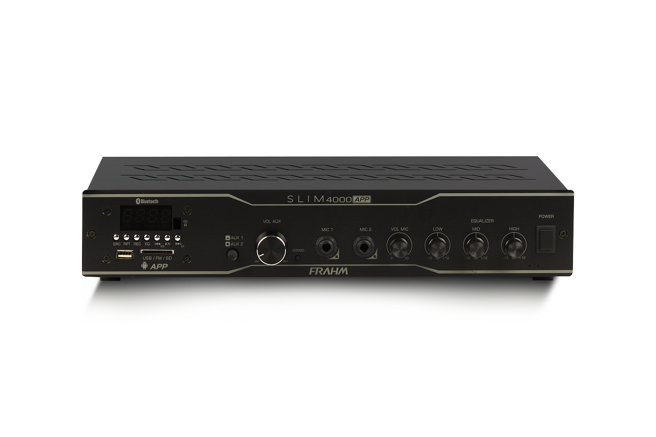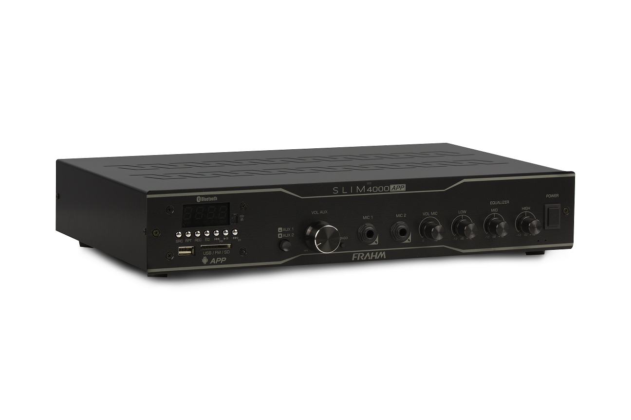 O amplificador Slim 4000 APP da Frahm possui 400 Watts RMS de potência e é ideal para grandes ambientes. Possibilita comando de funções via aplicativo Frahm. Possui conexão USB, SD Card, auxiliar (RCA), entradas para 2 microfones com função “Volume Inteligente” (Baixa a trilha sonora automaticamente quando usado), função gongo (emite sinal sonoro para chamar atenção para uma comunicação), Rádio FM e Bluetooth.