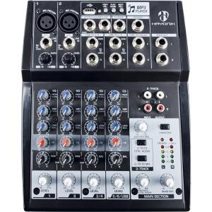 A mesa de som HMX-108 da HAYONIK conta com canais P10 balanceados e compatível com entradas desbalanceadas. Possui equalização fiel com ajuste de Low, Mind e High para um som mais encorpado. Botão de acionamento 2-Track para entrada do RCA e saída para o retorno/fone de ouvido. Com entrada USB para reprodução de MP3 para praticidade no uso. Além de ser compacto e leve para fácil transporte. Possui canais separados para fácil ajuste.